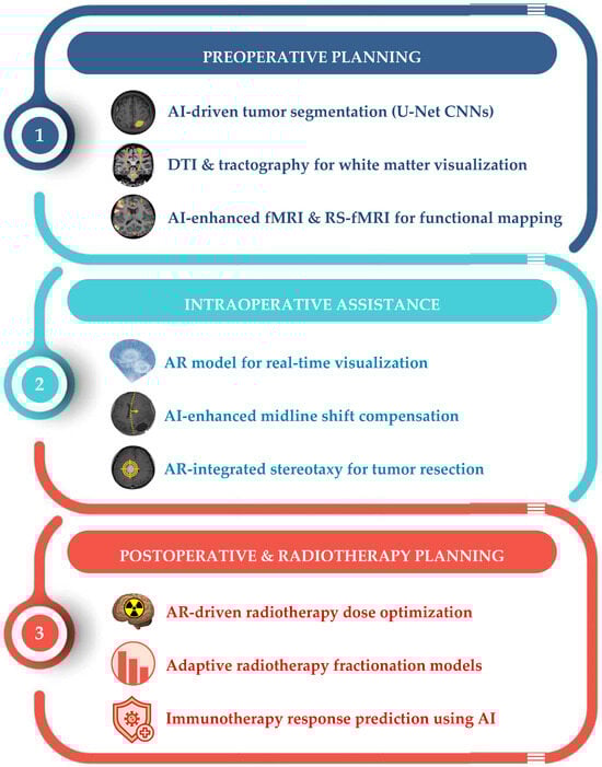 Linear flowchart summarizing how AI integrates different imaging and treatment modalities for preoperative planning, intraoperative guidance, and postoperative and radiotherapy planning in BMs. AI = artificial intelligence; AR = augmented reality; CNNs = convolutional neural networks; DTI = diffusion tensor imaging; fMRI = functional magnetic resonance imaging; RS-fMRI = resting-state functional magnetic resonance tomography.