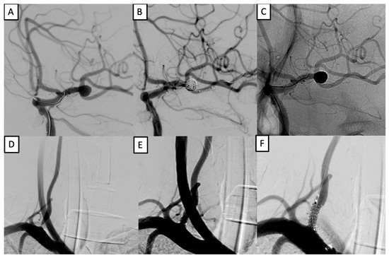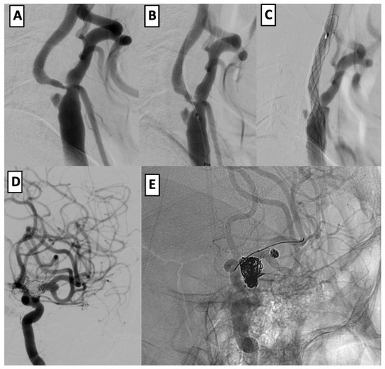 - Kaçar, E.; Nas, Ö.F.; Erdoğan, C.; Hakyemez, B. Single-stage endovascular treatment in patients with severe extracranial large vessel stenosis and concomitant ipsilateral unruptured intracranial aneurysm. Diagn. Interv. Radiol. 2015, 21, 476–482. [Google Scholar] [CrossRef] [PubMed] [PubMed Central]