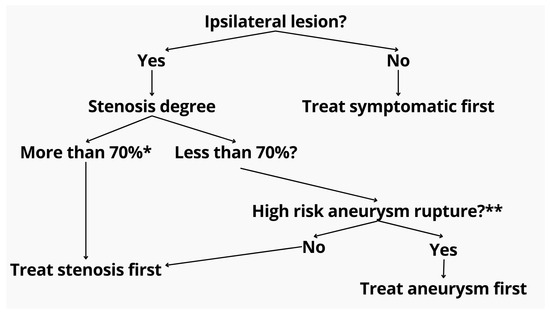 Proposed treatment algorithm for patients with coexisting extracranial stenosis and intracranial aneurysm. The initial step evaluates lesion ipsilaterality. If non-ipsilateral, the symptomatic pathology is prioritized. For ipsilateral lesions, the degree of stenosis is assessed. Stenoses exceeding 70% (as measured by NASCET criteria *) are treated first to ensure safe access and perfusion. If the stenosis is <70%, aneurysm rupture risk is evaluated using the PHASES score **. High-risk aneurysms are prioritized for embolization, while low-risk cases proceed with stenosis treatment. * North American Symptomatic Carotid Endarterectomy Trial (NASCET) criteria. ** Population, hypertension, age, size of aneurysm, earlier SAH, site of aneurysm (PHASES) score.