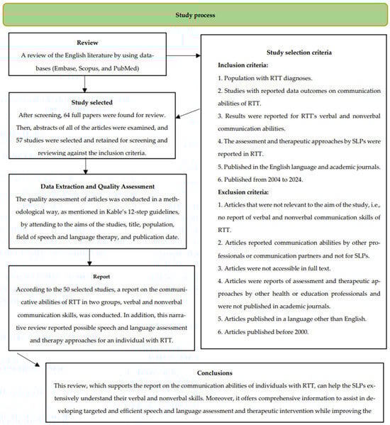 The present review adhered to the structured 12-step approach outlined by Kable et al. (2012) [] to ensure a systematic and comprehensive evaluation of the relevant literature. Each step was carefully implemented, beginning with the formulation of the research question, which aimed to examine the communication abilities of individuals with Rett syndrome, as well as the assessment and intervention strategies employed by professionals.