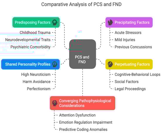 Comparative biopsychosocial model of shared mechanisms in Post-Concussion Syndrome (PCS) and Functional Neurological Disorder (FND). This figure outlines key overlapping domains between PCS and FND, structured around a biopsychosocial framework. The model includes predisposing factors (green): childhood trauma, neurodevelopmental traits, and psychiatric comorbidity that establish vulnerability; precipitating factors (purple): stressors, mild injuries, or prior concussions that may initiate symptom expression; perpetuating factors (yellow): psychosocial and cognitive mechanisms that maintain chronic symptoms, including behavioral loops and legal stressors; shared personality profiles (blue): traits such as high neuroticism, harm avoidance, and perfectionism that enhance symptom monitoring and catastrophizing; and converging pathophysiological considerations (red): network-level dysfunctions involving attention, emotional regulation, and predictive coding, seen across both conditions in neuroimaging studies.