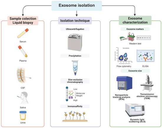 Workflow for the isolation and analysis of exosomal microRNAs in Parkinson’s disease. Stages of exosome isolation used in Parkinson’s disease research. Left panel: biofluid collection for liquid biopsy, including serum, plasma, cerebrospinal fluid (CSF), saliva, and urine. Middle panel: isolation techniques to enrich for exosomes, including ultracentrifugation, precipitation, size-exclusion chromatography, and immunoaffinity capture. Right panel: characterization of isolated exosomes using Western blot and ELISA to confirm exosomal markers, flow cytometry for vesicle surface profiling, and size determination through nanoparticle tracking analysis (NTA), transmission electron microscopy (TEM), and dynamic light scattering (DLS). This workflow enables robust isolation and characterization of exosomes for downstream miRNA profiling. Created in BioRender.com.