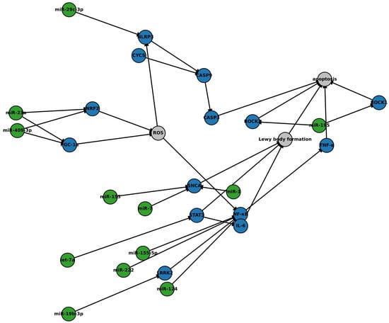 Conversely, other miRNAs appear to exacerbate the pathological processes underlying PD. miR-195, which is overexpressed in activated microglia, promotes ROCK1 signaling, a pathway associated with neuroinflammation and neuronal damage [28]. Similarly, miR-29c-3p and miR-155-5p regulate inflammatory cascades, including the NLRP3 inflammasome and the SOCS1/Nrf2 signaling pathway, altering microglial reactivity and immune responses [11,24]. In contrast, let-7a, which is generally associated with immune regulation, inhibits neuroinflammation triggered by α-synuclein. This suggests that the effects of miRNAs may be context-dependent and influenced by the disease stage or cellular environment [9].