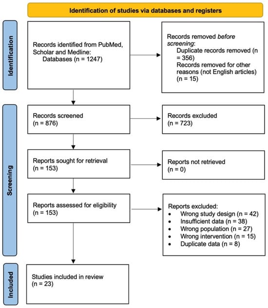 A comprehensive literature search was conducted using the PubMed, Embase, and Cochrane databases to identify relevant studies published up to March 2025. Search terms included “intraoperative neurophysiological monitoring”, “IONM”, “spinal surgery”, “somatosensory evoked potentials”, “motor evoked potentials”, “D-wave”, “electromyography”, “cost-effectiveness”, and “economic analysis”. Studies were included if they (1) evaluated IONM in spinal surgery; (2) reported clinical outcomes, diagnostic accuracy, or economic data; (3) were published in English; and (4) included human subjects. Case reports, letters, and conference abstracts were excluded. Two independent reviewers extracted data from the included studies. For clinical studies, the following data were extracted: study design, sample size, type of spinal surgery, IONM modalities used, neurological outcomes, sensitivity, specificity, and follow-up duration. For economic studies, data on costs, savings, cost-effectiveness thresholds, and economic models were extracted. Twenty-three studies were included in this review, as the PRISMA flow diagram in Figure 1 shows [5].
