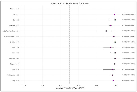 Forest plot of negative predictive value (NPV) estimates and 95% confidence intervals (CIs) for intraoperative neuromonitoring (IONM), by study [1,3,4,9,10,13,14,15,16,17,19,20,21,22].