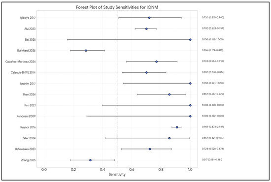 Forest plot of sensitivity estimates and 95% confidence intervals (CIs) for intraoperative neuromonitoring (IONM) in predicting neurological deficits, by study [1,3,4,9,10,13,14,15,16,17,19,20,21,22].