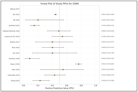 Forest plot of positive predictive value (PPV) estimates and 95% confidence intervals (CIs) for intraoperative neuromonitoring (IONM), by study [1,3,4,9,10,13,14,15,16,17,19,20,21,22].