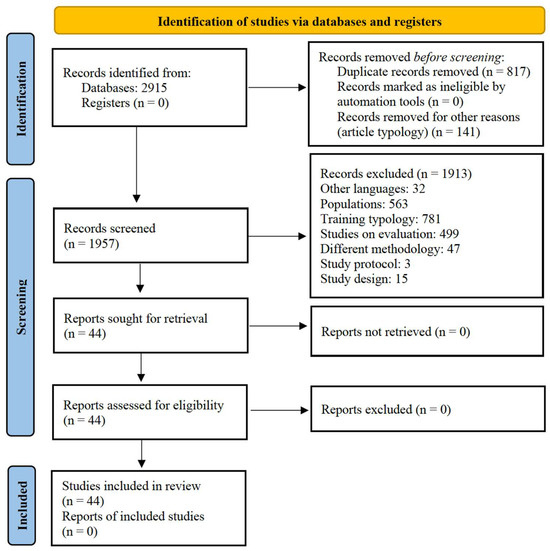 A total of 2915 articles (PubMed, 1624; Web of Science, 774; and Scopus, 517) were identified. After duplicate removal, 2098 studies were screened against the eligibility criteria. After title selection, 376 abstracts were screened, and a final number of 211 articles remained for the full-text review. After applying the full-text eligibility criteria, a final number of 44 original articles were included in the review. The selection process is presented in Figure 1.