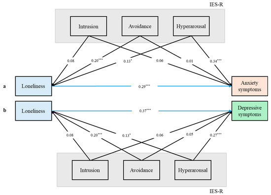 (a) Path analysis jointly testing the multivariate associations among the IES-R subscales, loneliness, and anxiety symptoms. (b) Path analysis jointly testing the multivariate associations among the IES-R subscales, loneliness, and depressive symptoms; *: p < 0.05; **: p < 0.01; ***: p < 0.001.