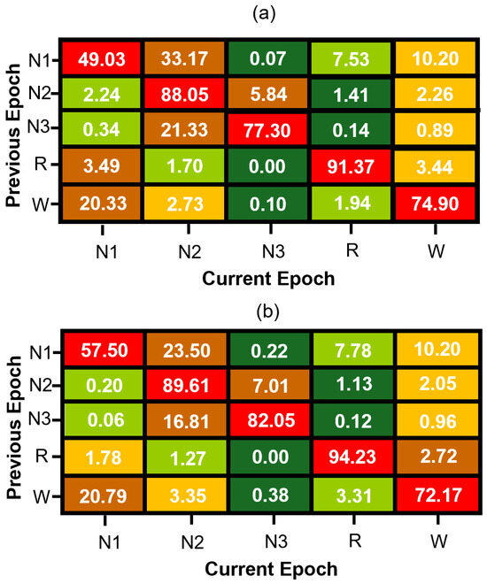 Normalized sleep stage transition matrices for (a) MASS SS3 and (b) MASS SS5 datasets. Each cell represents the percentage probability of transitioning to a current sleep stage (column) given the previous stage (row), computed from manually scored expert hypnograms. Rows are color-coded from green (lowest probability) to red (highest probability) to visually emphasize dominant and infrequent transitions within each sleep stage.