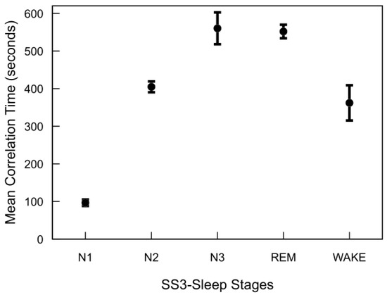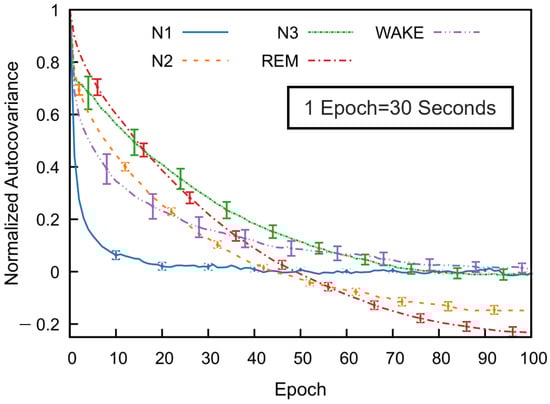 The estimated normalized covariance functions for each sleep stage indicator function were obtained by averaging all the autocovariance functions of all the participants. The autocorrelation time of each sleep stage was calculated using the discrete autocorrelation time equation that is given by