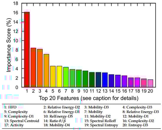 Wavelet components are crucial in sleep scoring as they provide a time–frequency representation of EEG signals, enabling the capture of transient features and frequency-specific patterns associated with different sleep stages [17,18,48]. Each epoch signal was decomposed using discrete wavelet transformation with the Daubechies-4 wavelet. The decomposition allowed the signal to be divided into five frequency bands, capturing both time- and frequency-domain characteristics. The selected bands of decomposed components and their importance are listed in Table 4.