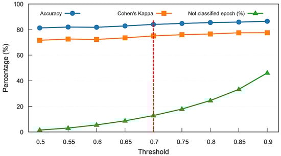 During testing, both the no-memory and memory-augmented models independently generated sleep stage predictions for each epoch. For every prediction, the maximum softmax probability (i.e., model confidence) was recorded. A comprehensive analysis was performed to identify the optimal confidence threshold, evaluating the trade-off between classification coverage (proportion of classified epochs) and classification reliability (accuracy and Kappa values). Based on this threshold-level sweep—which is detailed in the Section 4 —a confidence threshold of 0.7 was selected as the optimal balance between accuracy, reliability, and minimal rejection rate, which is lower than the number of ambiguous epochs that have stage transitions.