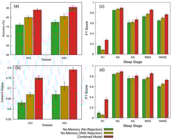 This inference-time integration of both models—selecting the prediction from the model with higher confidence when available—is referred to as the Combined Model throughout the remainder of this paper. This confidence-guided selection scheme enables fallback to the more reliable model for each epoch and avoids committing to low-confidence predictions, thereby improving both classification accuracy and reliability [50,51].