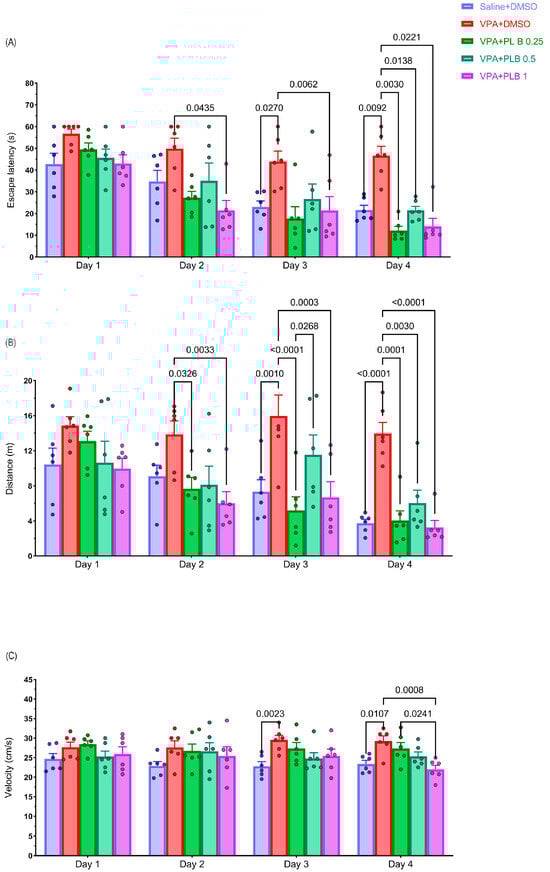 The repeated-measures analysis of the traveled distance revealed a significant difference in the time (F (3, 15) = 11.38, p = 0.0004) among groups (F (4, 20) = 16.29, p < 0.0001). However, their interaction did not reach statistical significance (F (12, 60) = 1.52, p = 0.1002). On the second day, the distance traveled decreased in the VPA+PLB 0.25-treated pups (p = 0.04) and VPA+PLB 1-treated pups (p = 0.004) compared to the VPA+DMSO-treated pups. Furthermore, on both the third and fourth days, the distance traveled by the VPA+DMSO-treated pups was significantly longer than the saline+DMSO-treated pups on day 3 (p = 0.0011) and day 4 (p < 0.0001), emphasizing a disability in spatial learning. All the groups treated with PLB exhibited a substantial decrease in the traveled distance compared to the VPA+DMSO-treated pups. On day 3, the VPA+PLB 0.25-treated pups (p < 0.0001) and VPA+PLB 1-treated pups (p = 0.0004) showed a significant decrease in the traveled distance. On day 4, the VPA+PLB 0.25-treated pups (p = 0.001) and VPA+PLB 1-treated pups (p < 0.0001) exhibited a significant decrease in the traveled distance compared to the VPA+DMSO pups. Additionally, the VPA+PLB 0.5-treated pups showed a significant decrease on day 4 (p = 0.003) compared to the VPA+DMSO pups (Figure 1B).