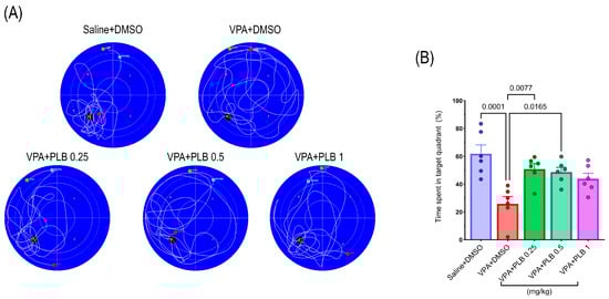 At PND 34, the spatial memory was tested with a single probe trial. The one-way ANOVA showed a significant effect between groups (F (4, 25) = 7.74, p = 0.0003). Based on the post hoc analyses, the percentage of time spent in the target quadrant significantly decreased in the VPA+DMSO pups (p = 0.0001) compared with the saline+DMSO-treated pups. Conversely, the groups treated with PLB 0.25 (p = 0.007) or 0.5 mg/kg (p = 0.01) exhibited a significant increase in the time spent in the target quadrant compared with the VPA+DMSO group, suggesting an enhanced spatial memory (Figure 2A,B).