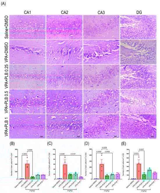 The Nissl staining data in the hippocampus revealed a significant ANOVA result for the CA1 (X2 = 22.06, df = 4, p = 0.0002), CA2 (X2 = 24.06, df = 4, p < 0.0001), CA3 (X2 = 20.34, df = 4, p = 0.0004), and DG (X2 = 32.83, DF = 4, p < 0.0001) regions. The post hoc comparisons showed that the number of dark cells in CA1 was significantly increased in the VPA+DMSO pups (p = 0.0006) and VPA+PLB 0.5 pups (p = 0.02) compared to the saline+DMSO-treated pups. The number of dark cells in CA1 was significantly decreased in the PLB 0.25-treated pups (p = 0.008) compared to the VPA+DMSO pups (Figure 3A,B). In the CA2 region of the hippocampus, the number of dark cells was increased in the VPA+DMSO-treated pups (p < 0.0001) compared with the saline+DMSO-treated pups. A reduction in the number of dark cells was found in the VPA+PLB 1 pups (p = 0.004) compared to the VPA+DMSO-treated pups (Figure 3A,C). Subsequently, in the CA3 region of the hippocampus, the number of dark cells was significantly decreased in the VPA+DMSO-treated pups (p = 0.0008) compared with the saline+DMSO-treated pups. The number of dark cells was significantly decreased in the VPA+PLB 0.25 pups (p = 0.02) and VPA+PLB 1 pups (p = 0.03) compared with the VPA+DMSO-treated pups (Figure 3A,D). In the DG, there was a significant difference in the number of dark cells in the VPA+DMSO-treated pups (p < 0.0001) and VPA+PLB 0.5-treated pups (p = 0.001) compared to the saline+DMSO-treated pups. A reduction in the number of dark cells was found in the VPA+PLB 0.25 pups (p = 0.001) (Figure 3A,E).