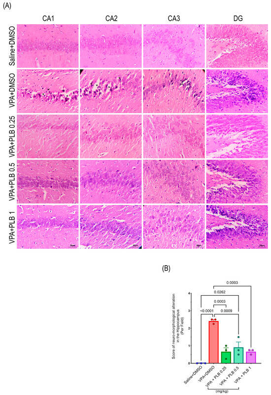 The severity of hippocampal neuro-morphological alterations was assessed by H&E staining (Table 3). In the saline+DMSO-treated pups, round and tightly packed dentate granule cells and pyramidal cells, characterized by light-stained nuclei, were observed; this indicated a normal morphology in the hippocampal regions (CA1, CA2, CA3, and DG). In contrast, pyknotic cells with dark-stained nuclei, vacuolation, and a disorganized cell arrangement were found in the VPA+DMSO-treated pups, indicating severe alterations (Figure 4A). The ANOVA result showed a significant alteration in the neuro-morphology of the hippocampus (x = 26.30, df = 4, p < 0.0001). The post hoc multiple comparisons in the VPA+DMSO (p < 0.0001) and VPA+PLB 0.5 (p = 0.02) pups revealed a significant neuro-morphological alteration compared to the saline+DMSO-treated pups. Additionally, the VPA+PLB 0.25-treated pups (p = 0.0003), VPA+PLB 0.5 pups (p = 0.0008), and VPA+PLB 1 pups (p = 0.0003) exhibited significantly improved neuro-morphological alterations compared to the VPA+DMSO-treated pups (Figure 4B).