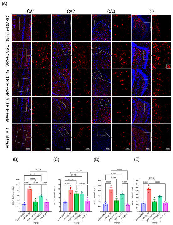 In the DG region, a significant increase in GFAP-positive cells was observed for both the VPA+ DMSO (p < 0.001) and VPA+PLB 0.5 (p = 0.009) groups when compared to the saline+DMSO pups. In parallel, a reduction in GFAP-positive cells was observed for the VPA+PLB 0.25-treated (p < 0.0001), VPA+PLB 0.5-treated (p = 0.007), and VPA+PLB 1-treated (p < 0.0001) pups compared to the VPA+DMSO pups. Furthermore, among the PLB-treated groups, the VPA+PLB 0.25-treated pups exhibited lower GFAP-positive cell counts compared to the VPA+PLB 0.5-treated pups (p = 0.01).
