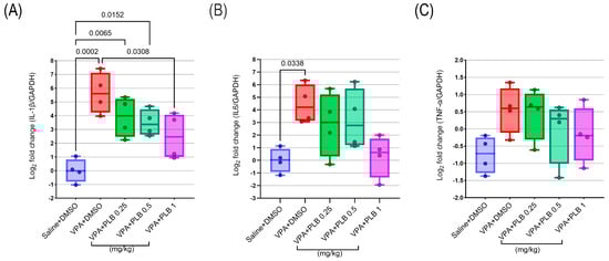 A significant increase in the expression of IL-6 was detected in the VPA+DMSO group compared to the saline+DMSO-treated pups. Moreover, a reduction in the IL-6 expression was observed for the VPA+PLB 1-treated pups, but this reduction did not reach statistical significance (p = 0.05).