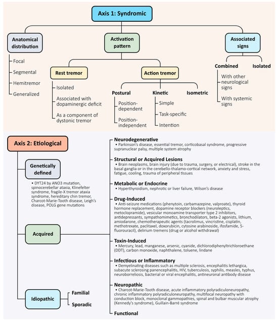Two-axis classification framework for tremor syndromes. Tremors are classified along two complementary axes, as proposed by the 2018 consensus criteria [5]. Axis 1 defines the clinical syndrome and includes three core descriptors: anatomical distribution (focal, segmental, hemitremor, generalised), activation pattern (rest, postural, kinetic, intention, task-specific, or isometric), and associated neurological signs (isolated vs combined). Axis 2 specifies the underlying aetiology, which may be acquired (e.g., neurodegenerative, toxic, metabolic), genetically defined (monogenic or syndromic), or idiopathic—including both familial and sporadic forms in the absence of a confirmed cause. This dual-axis model supports structured clinical reasoning and accommodates diagnostic evolution over time.