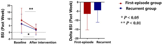 Primary outcome. BSI (Past Week) scores before and after 2-week TMS intervention in first-episode and recurrent depressive disorder groups. Both groups showed significant reductions in BSI scores (p < 0.05, p < 0.01).