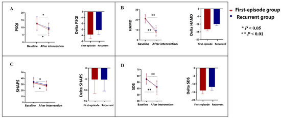 (A–D) Secondary outcomes. Changes in clinical measures before and after 2-week TMS intervention in first-episode and recurrent depressive disorder groups. (A) Pittsburgh Sleep Quality Index (PSQI); (B) Hamilton Depression Rating Scale (HAMD); (C) Snaith–Hamilton Pleasure Scale (SHAPS); (D) Self-rating Depression Scale (SDS). All measures showed significant improvement after intervention in both groups (p < 0.05, p < 0.01).