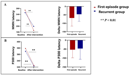 (A,B) Event-related potentials. Changes in MMN and P300 latencies before and after 2-week TMS intervention in first-episode and recurrent depressive disorder groups. (A) Mismatch negativity (MMN) latency; (B) P300 latency. Both MMN and P300 latencies significantly decreased after intervention in both groups (p < 0.01).
