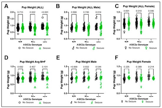 Changes in embryo weight at E17.5. Pup weight was (A) significantly lower in ASIC2a+/− and −/− mice exposed to seizures when individual embryos were plotted regardless of litter; (B) lower in −/− males following seizure exposure; (C) lower in +/− and −/− females following seizure exposure (n = 34–96). Average embryo weight was unchanged following seizure exposure in (D) combined sex, (E) male, or (F) female embryos (n = 16–36). Dots represent individual embryos (A–C) or average embryo weight per litter (D,E). p-values are indicated above respective pairwise comparisons. Data analyzed using Two-Way ANOVA followed by Sidak’s Multiple Comparison test.