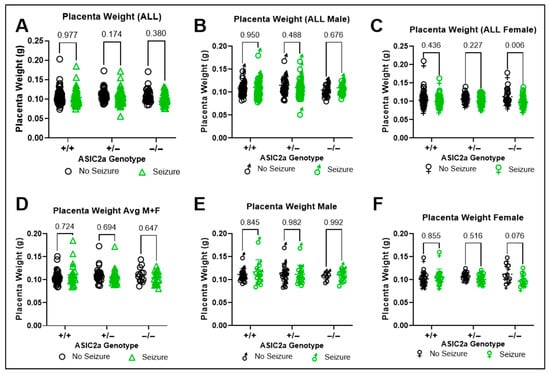 Changes in placenta weight at E17.5. Placenta weight was (A) not different within genotypes after seizure exposure when individual pups were plotted regardless of litter; (B) not different in males following seizure exposure; (C) lower in ASIC2a−/− females following seizure exposure (n = 34–96). Average placenta weight was unchanged following seizure exposure in (D) combined sex, (E) male, or (F) female placentas (n = 16–36). Dots represent individual pups (A–C) or average placenta weight per litter (D,E). p-values are indicated above respective pairwise comparisons. Data analyzed using Two-Way ANOVA followed by Sidak’s Multiple Comparison test.