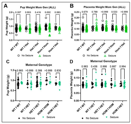 Studies assessing the impact of maternal seizures during pregnancy on birthweight are complex. Studies have assessed birthweight in women with epilepsy and have found increased risk of low birth weight and preterm delivery, and a further increased risk in epilepsy patients who experienced seizure during pregnancy []. Another study showed that women with epilepsy are more likely to have a low birthweight offspring, and that IUGR was associated with anti-epilepsy drug treatment [,]. While these studies indicate reduced birthweight in women with epilepsy, the condition of epilepsy is chronic, unlike our study, where the pregnant dam experienced a single, acute seizure exposure. Our study shows that even acute seizure exposure reduces embryo and placenta weight in exposed offspring at E17.5. We utilized pentylenetetrazol as the seizure-inducing agent because it is commonly used in pregnancy studies [,,,,,,]. It is possible that the use of other agents, such as kainic acid, lithium, and pilocarpine, may yield different results.