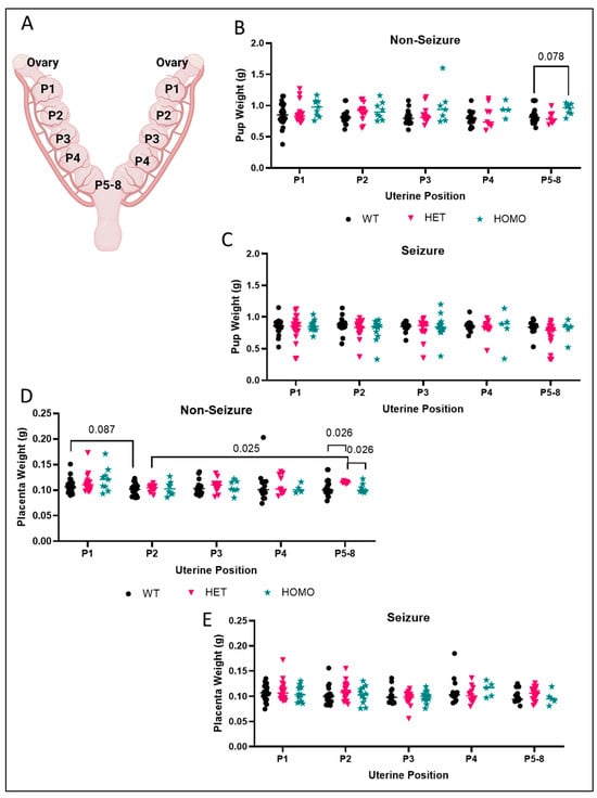 Position on the uterine horn has a modest effect on embryo weight and no influence on placenta weight. (A) Schematic of the uterine horn used to define embryo location. Left and right uterine horns were not separated from analysis due to small sample sizes for some positions. The schematic of the position of the uterine horn was created using BioRender.com. (B) In embryos not exposed to seizures, homozygous pups had increased weight compared to wild-type (n = 2–27). (C) No difference in pup weight between genotypes and within uterine positions following seizure exposure (n = 5–21). Dots represent individual embryo weight (A–C) or individual placenta weight (D,E). p-values are indicated above respective pairwise comparisons. Data analyzed using Two-Way ANOVA followed by Sidak’s Multiple Comparison test.