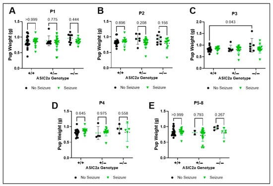 No difference in embryo weight following seizure exposure. Pup weight was not different at (A) P1, (B) P2, (C) P3, (D) P4, or (E) P5-8 between non-seizure exposed and seizure exposed pups (n = 2–27). Dots represent individual pup weight. p-values are indicated above respective pairwise comparisons. Data analyzed using Two-Way ANOVA followed by Sidak’s Multiple Comparison test.