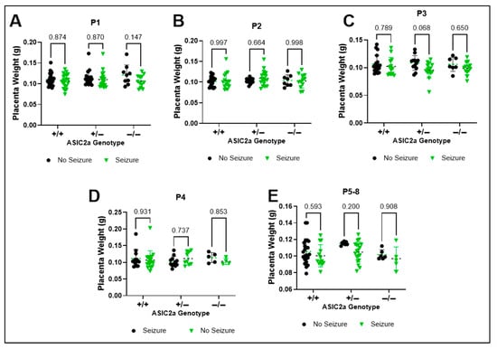 No difference in placenta weight following seizure exposure. Placenta weight was not different at (A) P1, (B) P2, (C) P3, (D) P4, or (E) P5-8 between non-seizure exposed and seizure exposed placentas (n = 2–27). Dots represent individual placenta weights. p-values are indicated above respective pairwise comparisons. Data analyzed using Two-Way ANOVA followed by Sidak’s Multiple Comparison test.