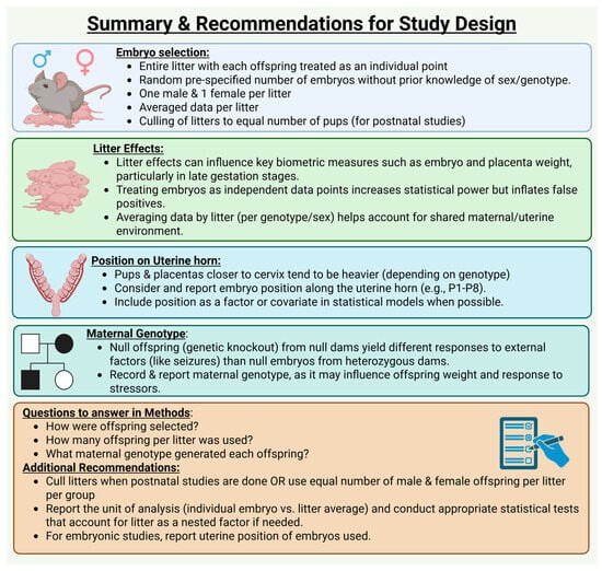 In conclusion, litters should be treated as a single unit rather than broken down into independent individual fetal–placental units. In in utero analyses, investigators should consider location on the uterine horn as a variable and should select from similar locations or should randomize as best as possible. When random selection cannot be performed and several offspring per litter are assigned to groups/treatments, average data per sex and genotype per litter should be used. This will eliminate the litter effect. Additionally, researchers using rodent models should consider litter size and cull litters to similar sizes when applicable. Moreover, while the position on the uterine horn cannot be determined after delivery, researchers should consider uterine position as a potential source of variability and outline the selection method used when assigning rodents to experimental groups. Importantly, when ordering rodents from commercial sources, researchers should inquire about and note whether the animals received were from mixed or single litters, and ensure equal assignment of rodents from each litter to each group/treatment. Considering all these variables and reporting them in the methods section of studies will increase the chances of reproducing reported research findings.