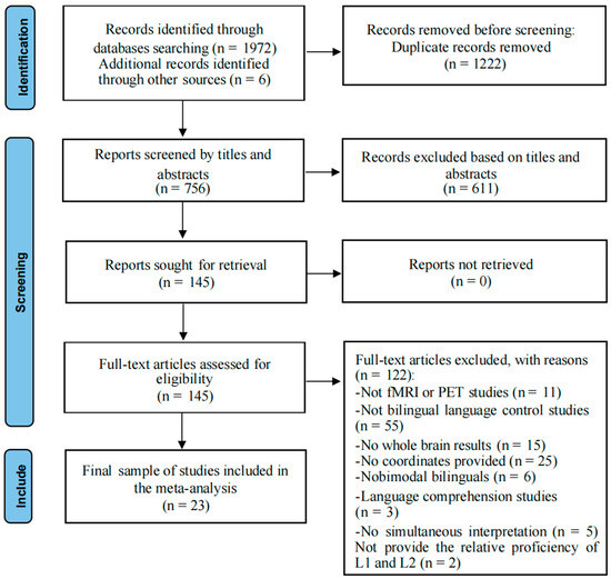 This meta-analysis was conducted using the Preferred Reporting Items for Systematic Reviews and Meta-Analysis (PRISMA) statement guidelines (http://www.prisma-statement.org/ (accessed on 16 December 2024)) [29], as well as more recent guidelines for conducting systematic reviews [30,31]. Notably, our meta-analyses were not preregistered. We conducted a literature search on the Web of Science and PubMed databases using the terms “bilingual language control” combined with “functional magnetic resonance imaging (fMRI)”, “Positron Emission Tomography (PET)”, “brain imaging”, or “neuroimaging” up to December 2024. This preliminary search yielded a total of 1972 records from both platforms; 750 articles remained after removing duplicates (n = 1222). Six additional studies [32,33,34,35,36,37] were identified through complementary search methods, namely backward reference searching (checking reference lists in published articles) [14], resulting in 756 records for initial screening. Two authors independently conducted the first round of screening based on titles and abstracts, using the following inclusion criteria: (1) fMRI or PET studies; (2) studies that recruited healthy adults aged 18–50; (3) peer-reviewed journal articles (excluding conference papers or abstracts). A total of 145 articles passed the first round of screening and were then read in full to confirm their eligibility. In the second round of screening, studies containing any of the following characteristics were excluded from further analyses: (1) did not use fMRI or PET techniques (n = 11); (2) not primarily focused on bilingual language control (n = 55); (3) did not report whole-brain activation (n = 15); (4) did not report peak coordinates in Talairach or Montreal Neurological Institute (MNI) stereotaxic space (n = 25); (5) involving bimodal bilinguals (i.e., one of the languages is sign language; n = 6); (6) involving language comprehension studies (n = 3). The exclusion criterion 6 was made because the control processes involved in language production and comprehension are not entirely the same [38,39]. (7) examined bilingual language control performance in relatively extreme contexts, namely interpreting or simultaneous translation (n = 5). The exclusion criterion 7 was made because these studies often investigate the mechanisms behind professional performance or specific strategies behind translation, rather than bilingual language control itself; and the type of bilingual language control required during interpreting and translation is different from the typical bilingual language control required by bilinguals in everyday language use environments [14].
