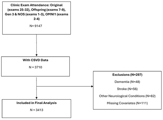 We included original, offspring, Gen 3, NOS, and Omni 1 cohorts who attended at least one clinic exam in which brain MRI was performed during the period of 1999–2019. All participants were invited for brain MRI during their examination cycles and included if they had brain MRI. Brain MRIs were conducted within a one-year period before or up to five years following the clinical examination. Of the 9147 participants who attended the clinic exam (original cohort exam: 25–32; offspring exam: 7–9; Gen 3 and NOS exam: 1–3; Omni 1 exam: 2–4), 3710 had at least one MRI with assessment for all CSVD markers. The final sample consisted of 3413 participants after excluding 297 for history of stroke, dementia, or other neurological conditions. The first available MRI was selected for participants who had more than one MRI with CSVD marker ratings. Participants sample selection is shown in Figure 1.