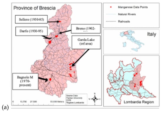 Study design: This pilot study targeted Mn-exposed ferroalloy workers and age- and sex-matched historical control workers from the PHIME (Public Health Impact of Metal Exposure) occupational cohort of ferroalloy workers initiated by author RL in the 1990s in the Province of Brescia, Italy [29,30,31,32,33,34]. The PHIME project enrolled also children, elderly and patients affected by neurodegenerative disorders, all residing in the same geographical area [35,36,37,38,39,40,41,42,43,44]. The initial workers cohort included more than 400 subjects, employed in ferroalloy industries located in different areas of the province of Brescia, Northern Italy: (i) three historical plants, active from 1901 to 2001 in the towns of Sellero, Darfo, Breno situated along Valcamonica, a valley of the pre-Alps region, (ii) a currently active plant in the town of Bagnolo Mella, in the plain area of the same province, Figure 1a, where ferroalloy operations started in the 1970s, with electric furnaces crushing and melting Mn ore for the production of ferro-Mn and silico-Mn alloys Figure 1b, although with progressively diminishing production due to the high cost of energy.
