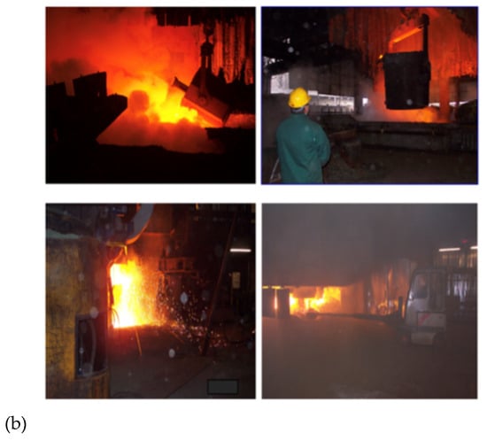 (a) The industry plants of Sellero, Darfo, Breno, Bagnolo Mella, and the reference area of Garda Lake in the province of Brescia, northern Italy. (b) Workplace areas including furnaces and casting.