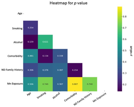 Age was tested as a categorized variable with two ranges 54–61, and 62–69. The corresponding p-values of Phi value-Cramer’s V (coefficient data) from all 2 × 2 contingency tables presented in the heatmap, Figure 2. No significant differences were observed for age, smoking, alcohol consumption, family history of neurodegenerative diseases, and comorbidity (such as hypertension and cardiovascular diseases) as shown in Figure 2.