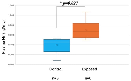 Plasma manganese (PMn) levels (ng/mL), measured using Inductively Coupled Plasma Mass Spectrometry (ICP-MS), differed significantly between exposed workers and controls (p = 0.027). The exposed group showed higher concentrations (mean ± SD: 0.704 ± 0.20; median: 0.67) compared to controls (mean ± SD: 0.397 ± 0.18; median: 0.45), supporting evidence of occupational Mn exposure as shown in Figure 3.