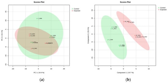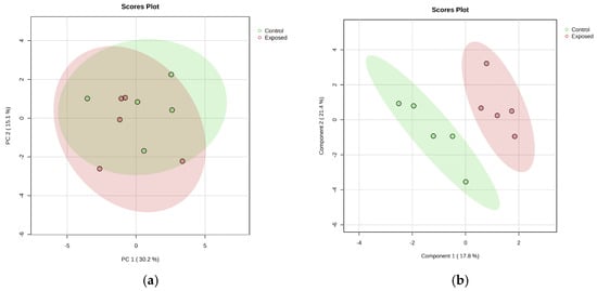 Statistical Analysis: Initial analyses involved descriptive statistics and Fisher’s Exact Test for categorical variables. Student’s t-test was used to compare the mean values between the two groups of exposed and control workers. Given the potential for skewed distributions in metabolite and lipid concentrations, log transformation was applied to meet the assumptions of normality and homogeneity of variances. ANCOVA (Analysis of Covariance) was utilized to adjust for confounders such as age, providing a more accurate assessment of the impact of manganese exposure on the outcomes. PCA (Principal Component Analysis) and PLS-DA (Partial Least-Squares Discriminant Analysis) were employed to visualize the complex data from metabolomic studies into fewer dimensions, which facilitated the identification of patterns, groupings, and outliers [46].