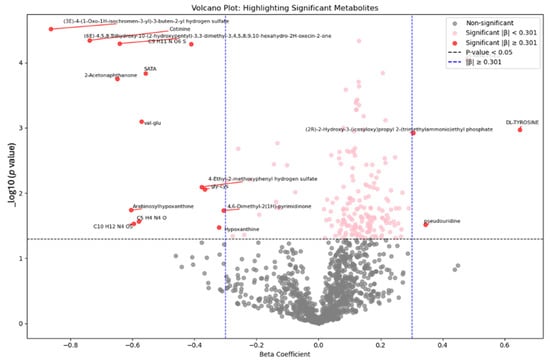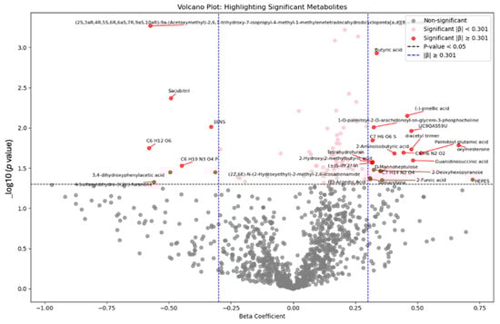 Volcano plot depicted the linear regression analysis results comparing metabolites as a dependent variable, plasma manganese as independent variable, and age as covariate. Each point represents a metabolite, with the X-axis indicating the beta coefficient (the strength and directionality of change in metabolite level), and the Y-axis showing the p value. The thresholds for beta coefficient representing a 2-fold change (β = 0.301), and p < 0.05.