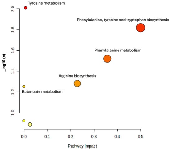 The pathway analysis has revealed that amino acid metabolism pathways, particularly those involving the biosynthesis of tyrosine, phenylalanine, and tryptophan, as well as the metabolism of alanine, aspartate, and glutamate, were significantly affected among the exposed workers. These pathways were consistently identified across non-age adjusted t-test (Figure S1), age-adjusted ANCOVA, Figure 7, and linear regression analyses, Figure 8, as primary targets of impact.