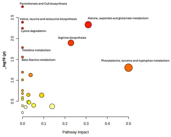 Scatter plot of Pathway Analysis of ANCOVA (comparing metabolites after adjusting for age) results that was conducted by hypergeometric test using Homo sapiens KEGG library as the reference. The X-axis indicating the impact or importance of respective pathways on Mn exposure study. The Y-axis describes the statistical significance of results (p-value). The size of bubble shows the number of compounds involved in the pathway that are affected by the exposure. Larger bubbles mean a greater number of compounds. The bubble color represents the magnitude of p-value, a more intense red color indicates a lower p-value.