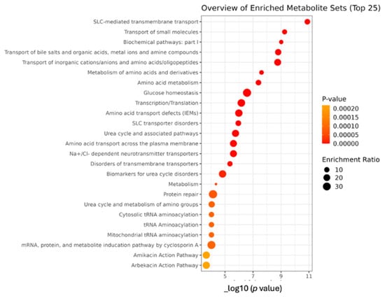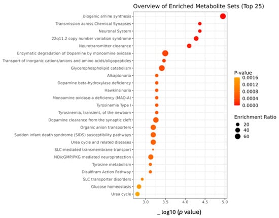 Dot plot of over-representation analysis (ORA). ORA used for enrichment assessment of linear regression results (where metabolites were modeled as a dependent variable, plasma manganese as independent variable, and age as covariate) using RaMP-DB as the reference indicating the top 25 enriched metabolite set in the study of metabolite profile of Mn-exposed workers than controls.