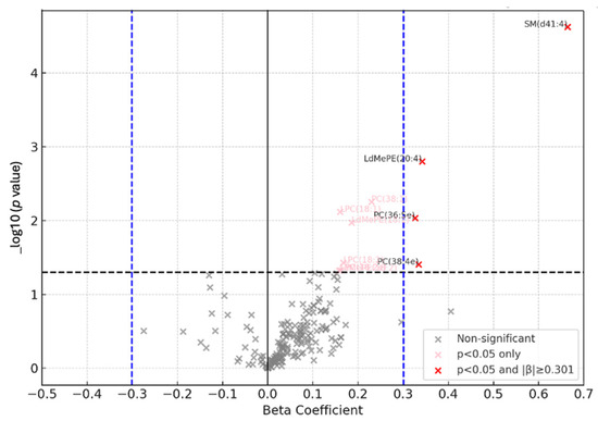 Volcano plot depicted the linear regression results (where plasma Mn was treated as independent variable, Lipid, as dependent variable, and Age as a covariate in the model) comparing lipids between the manganese-exposed group and controls controlling for age. Each point represents a metabolite, with the X-axis indicating the beta coefficient (the strength and directionality of change in metabolite level), and the Y-axis showing the p value. The thresholds for beta coefficient representing a 2-fold change (β = 0.301), and p < 0.05.