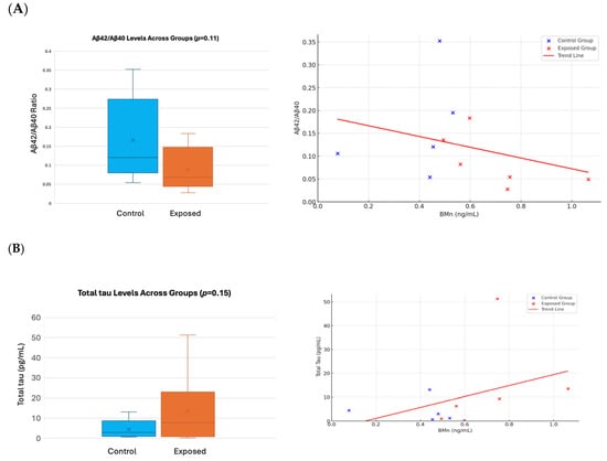 Emerging research shows that high manganese concentrations can influence plasma amyloid-beta and tau levels, posing a potential risk for Alzheimer’s disease [100,101]. In our study, the ultrasensitive Simoa platform has shown increased, albeit statistically non-significant, levels of Aβ42, Aβ40, total tau, NfL, and GFAP in the exposed workers to manganese, along with a decreased Aβ42/Aβ40 ratio when compared to control subjects. Inconsistencies are present in the literature regarding changes in Aβ40 and Aβ42 levels, with both elevations and reductions reported in conditions of MCI and AD. Aβ42, being a predominant C-terminal variant present in brain Aβ plaques, and the decreased Aβ42/Aβ40 in blood have been confirmed as one of the validated blood biomarkers inversely related to brain plaque burden, as measured by PET scans [102]. Total tau, and specifically phosphorylated tau (p-tau), constitute a second, more consistent blood biomarker for AD, exhibiting increased levels in cases with MCI and AD. A comprehensive study involving the ADNI and BioFINDER cohorts has verified elevated plasma tau concentrations in patients with Alzheimer’s disease dementia and marked correlations between levels of plasma tau and subsequent cognitive deterioration [103]. Aβ42/Aβ40 and APP669-711/Aβ42 are recognized as biomarkers indicative of brain amyloidosis, whereas tau signify acute neuronal injury and is not specific biomarkers of Alzheimer’s disease [24]. The findings of our study align with prior research, substantiating an elevated level of total tau (threefold higher than controls) and a diminished Aβ42/Aβ40 ratio (approximately half that of controls) in the Mn-exposed group, consistent with the diffuse Aβ deposition observed at the PET scan. The levels of NfL and GFAP have shown a moderate increase in the worker group, as is typically seen in AD. The small sample size may account for the absence of statistically significant results, failing to reach the p-value threshold of 0.05.