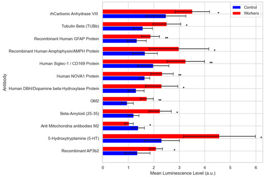 Bar chart depicting mean luminescence levels (±SD), reflecting relative plasma antibody abundance targeting autoimmune and neurological proteins in manganese (Mn)-exposed workers and unexposed controls. Antibody signals were quantified using a protein microarray platform. Statistical significance was determined using unpaired two-tailed Welch’s t-tests. Significance is indicated as follows: p < 0.05 (*), p < 0.001 (**).