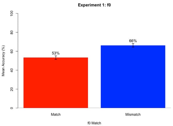 The significant positive simple effect of f0 Match indicates that accuracy for f0 Mismatch conditions (66%) was significantly higher than for f0 Match conditions (53%). Analysis of each participant’s mean accuracy for f0 Match and f0 Mismatch conditions indicated that all participants had higher accuracy scores for f0 mismatch compared to match conditions.